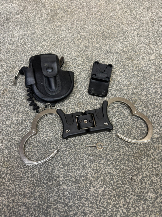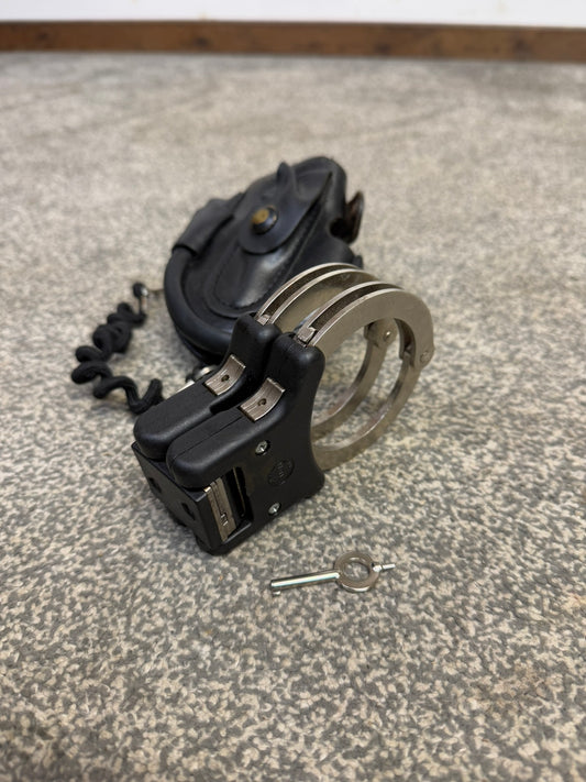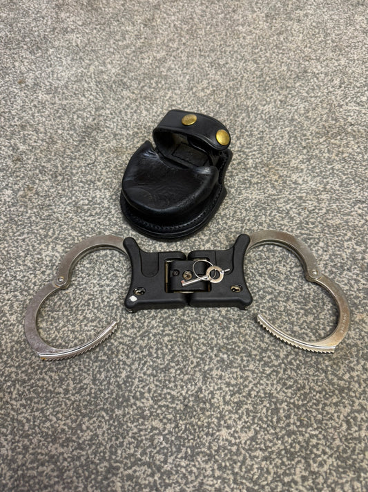 Ex Police Folding Hiatt Handcuffs Hinged Cuffs Belt Pouch & Key Security Collectible