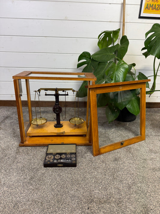 Vintage Philip Harris Scientific Balance Scales In Wood & Glass Case With Weights