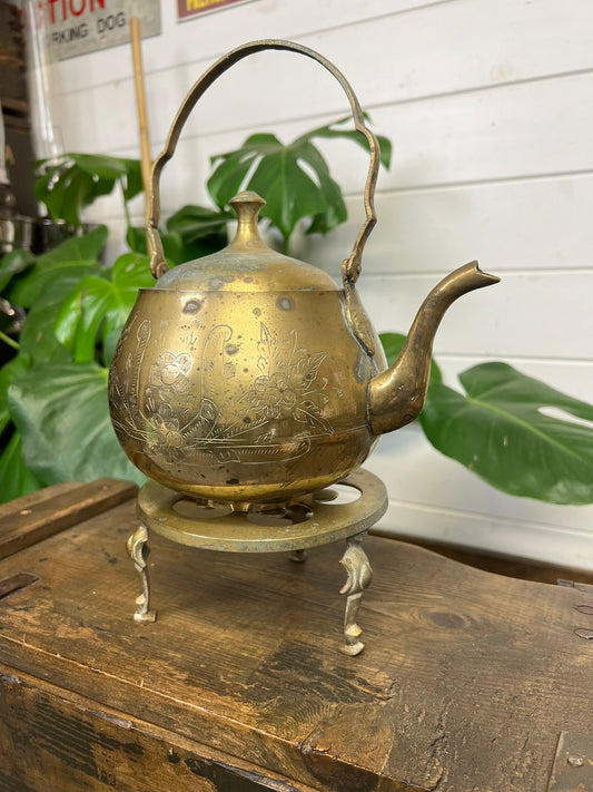 Vintage 70's Etched Brass Teapot Kettle & Trivet Stand Home Kitchen Decor