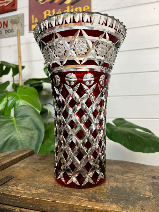 Vintage Ruby Red Cut to Clear Large Vase Art Deco Bohemian Decor