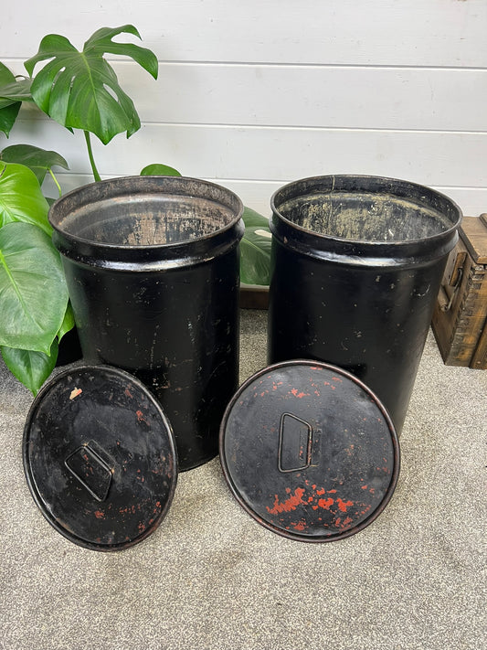 2x Small Metal Drums With Lids Vintage Display Storage Upcycle Stools Industrial Decor
