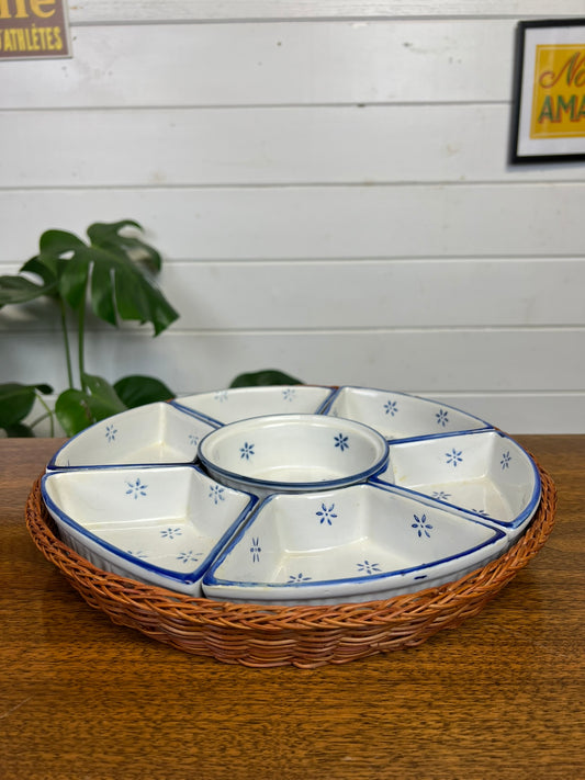 Vintage Ceramic Cobalt And White Serving Dish Tidbit Bowl In Wicker Basket