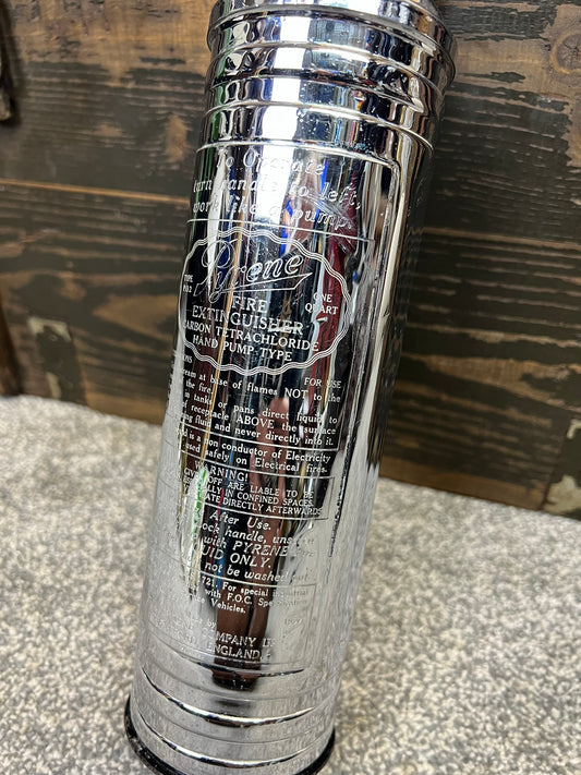 Vintage Chrome Pyrene Fire Extinguisher & Bracket Classic Car Old Retro Display Workshop Deco