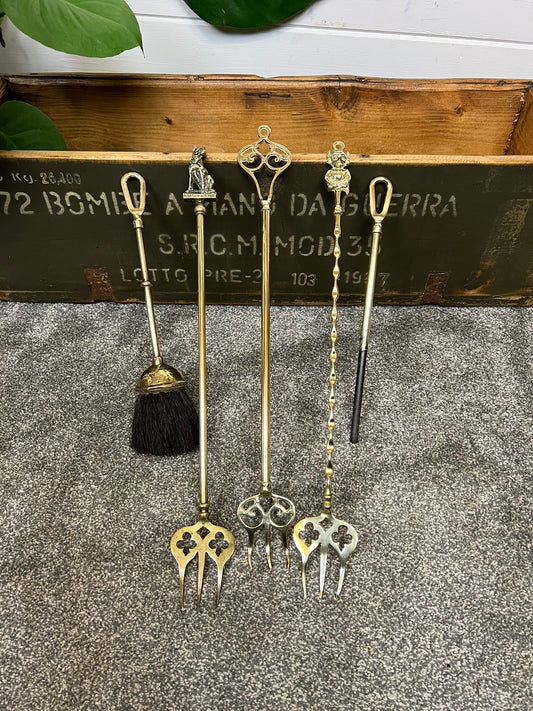 Vintage Brass Fire Companion Set Alsatian Lincoln Imp Toasting Fork Poker & Brush Art Nouveau Boho Decor