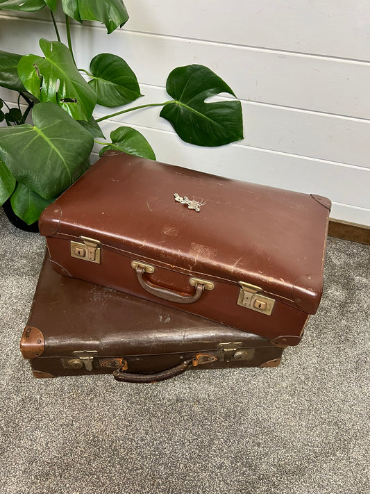 2x Vintage Suitcases Brown Travel Trunk Industrial Decor Photo Prop Display