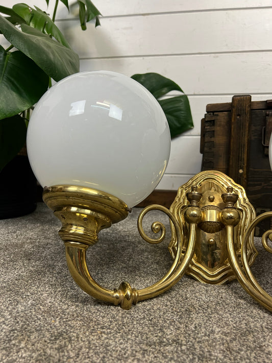 Vintage Brass Ornate Double Wall Lights With Glass Globes 20th Century Art Deco