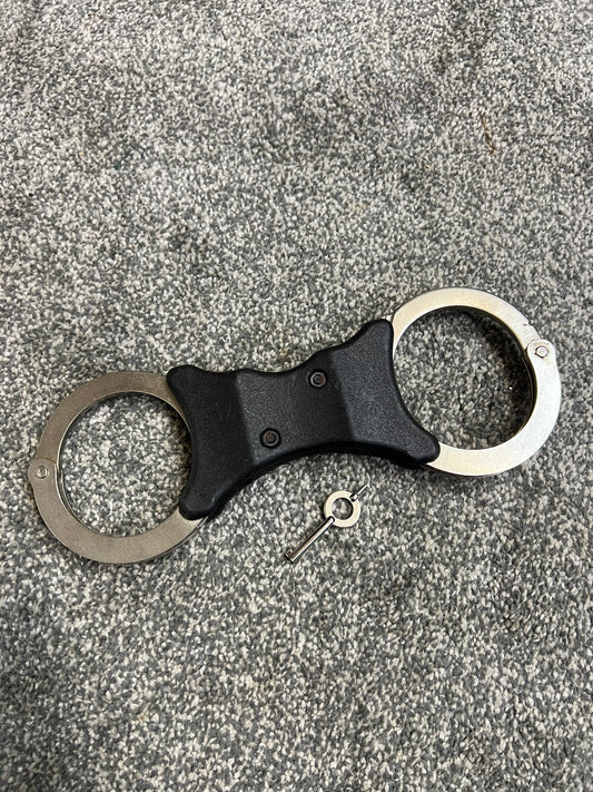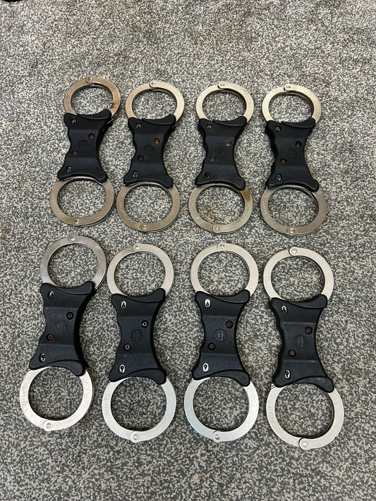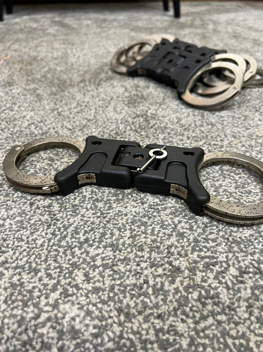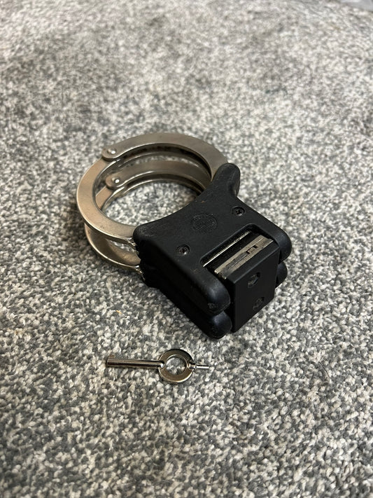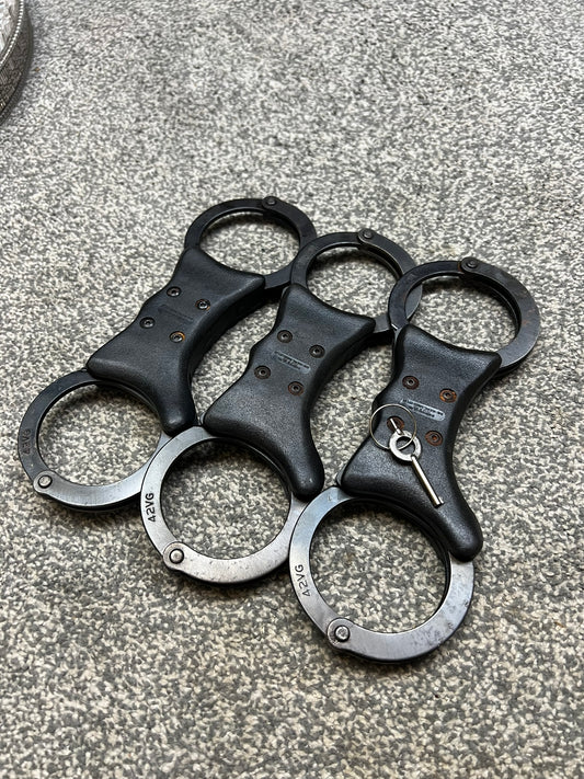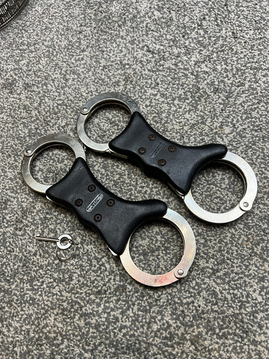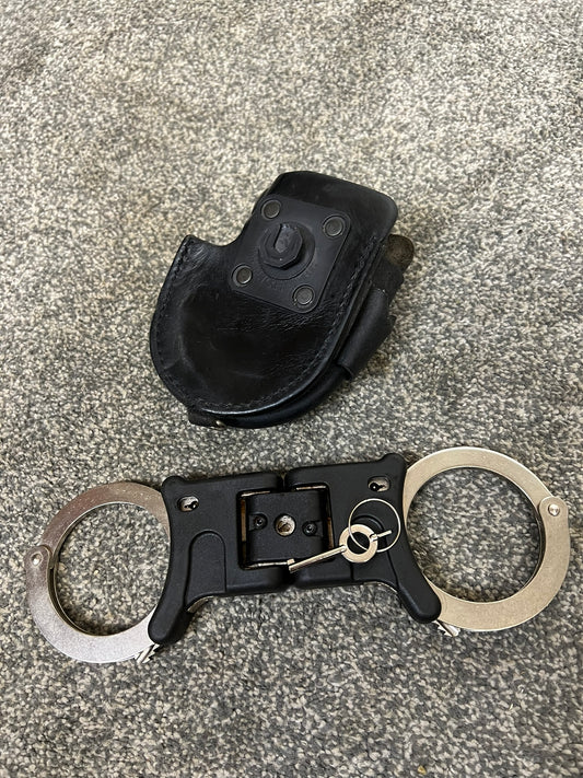 Ex Police Genuine Hiatt Folding Hinged Handcuffs & Key Security Collectible Memorabilia Restraint
