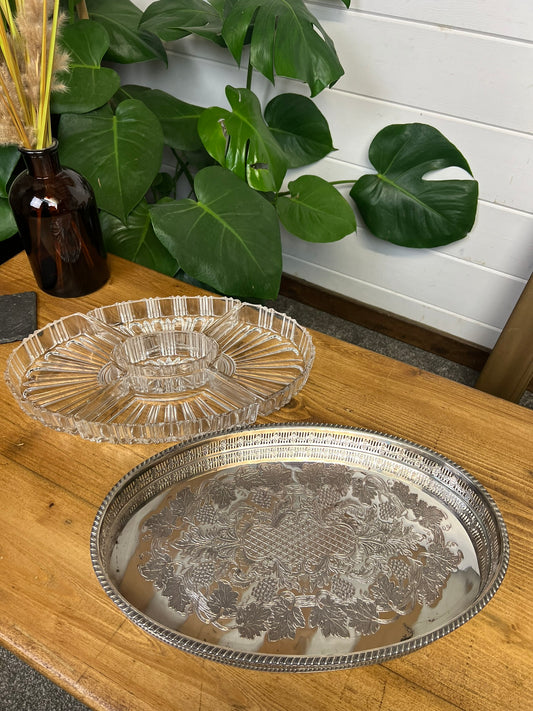 Vintage Viners Of Sheffield Silver Plated Oval Tray With Crystal Glass Serving Dishes
