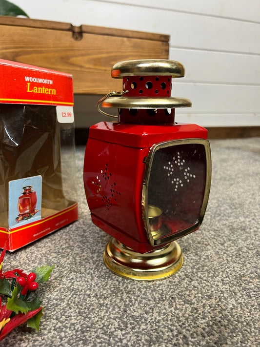Vintage Red Tin Candle Lantern In Box Made in Hong Kong 50's 60's Christmas Deco