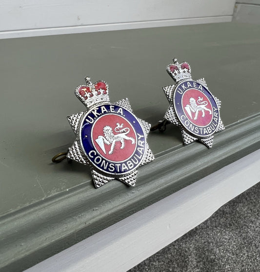 2x UKAEA United Kingdom Atomic Energy Constabulary Enamel Queens Crown Cap Badge Plate