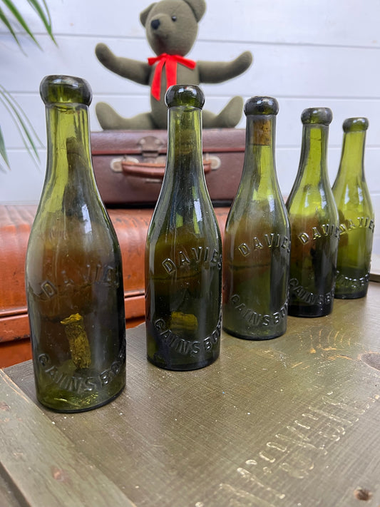 5x Vintage Green Glass Bottles "Davies, Gainsborough" Decorative Codd Neck Bottle Wedding Decor Rustic Home Deco