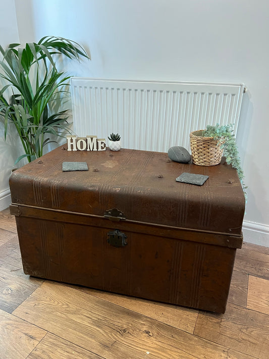 Vintage Metal Brown Travel Trunk Rustic Coffee Side Table Original Storage Steamer Chest
