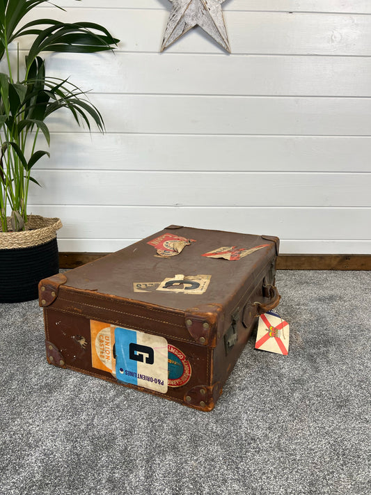 Vintage Brown Leather Suitcase Retro Travel Trunk Boho Décor Display British Made