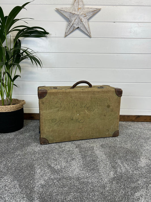 Vintage Canvas & Leather Suitcase Trunk Military Army Boho Rustic Home Décor