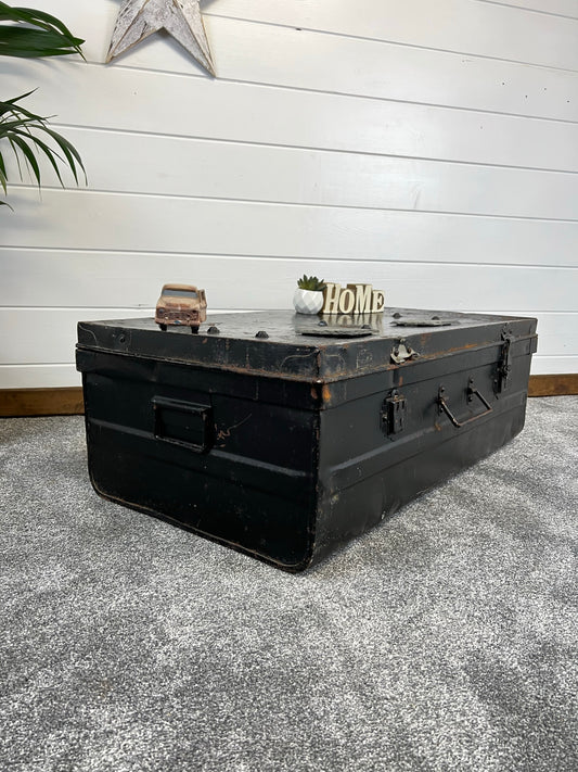 Vintage Metal Large Storage Trunk Rustic Black Coffee Side Table Original Toy Tool Chest