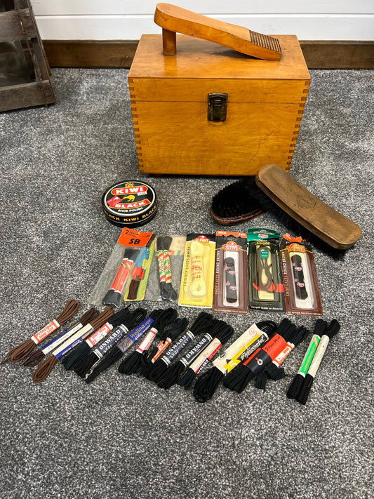 Vintage Wooden Shoe Shine Box Shoe Rest With Extra Laces Brushes