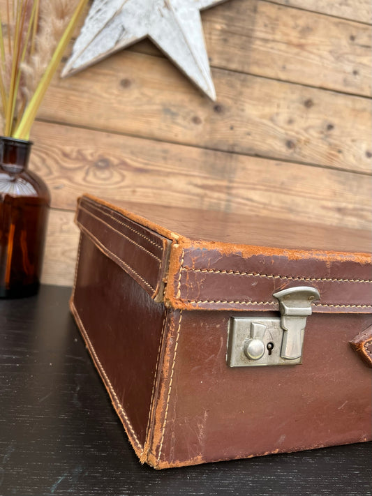 Vintage Cowhide Leather Suitcase Distressed Retro Trunk Décor Theatre Film Display