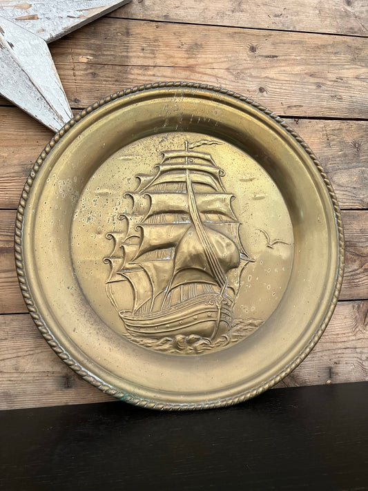 Vintage Large 17" Brass Wall Plate Decorative Galleon Ship Boho Bohemian Brass Décor