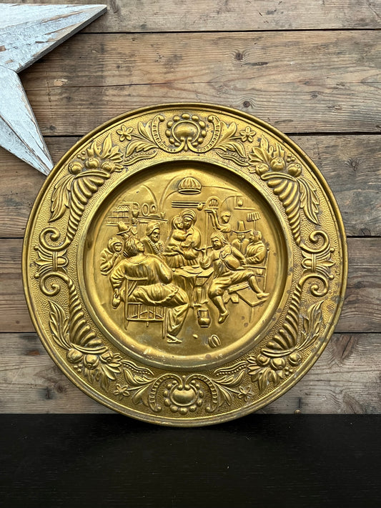 Vintage Large 17" Brass Wall Plate Decorative Tavern Scene Boho Bohemian Brass Décor
