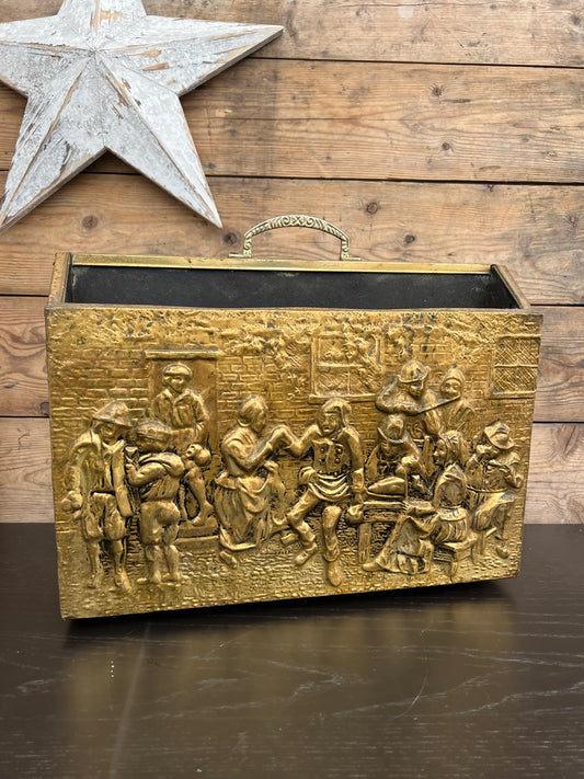 Vintage Brass Bound Double Magazine Rack Holder Tavern Scene