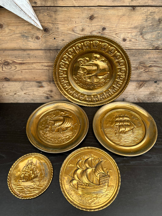 5x Vintage Decorative Brass Wall Plate Job Lot Galleon Ship Boho Bohemian Brass Décor