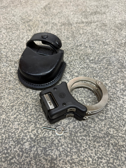 Ex Police Folding Hiatt Handcuffs Hinged Cuffs PSNI Leather Pouch & Key Security Collectible