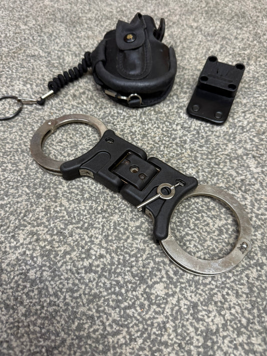 Ex Police Folding Hiatt Handcuffs Hinged Cuffs PSNI Leather Pouch & Key Security Collectible