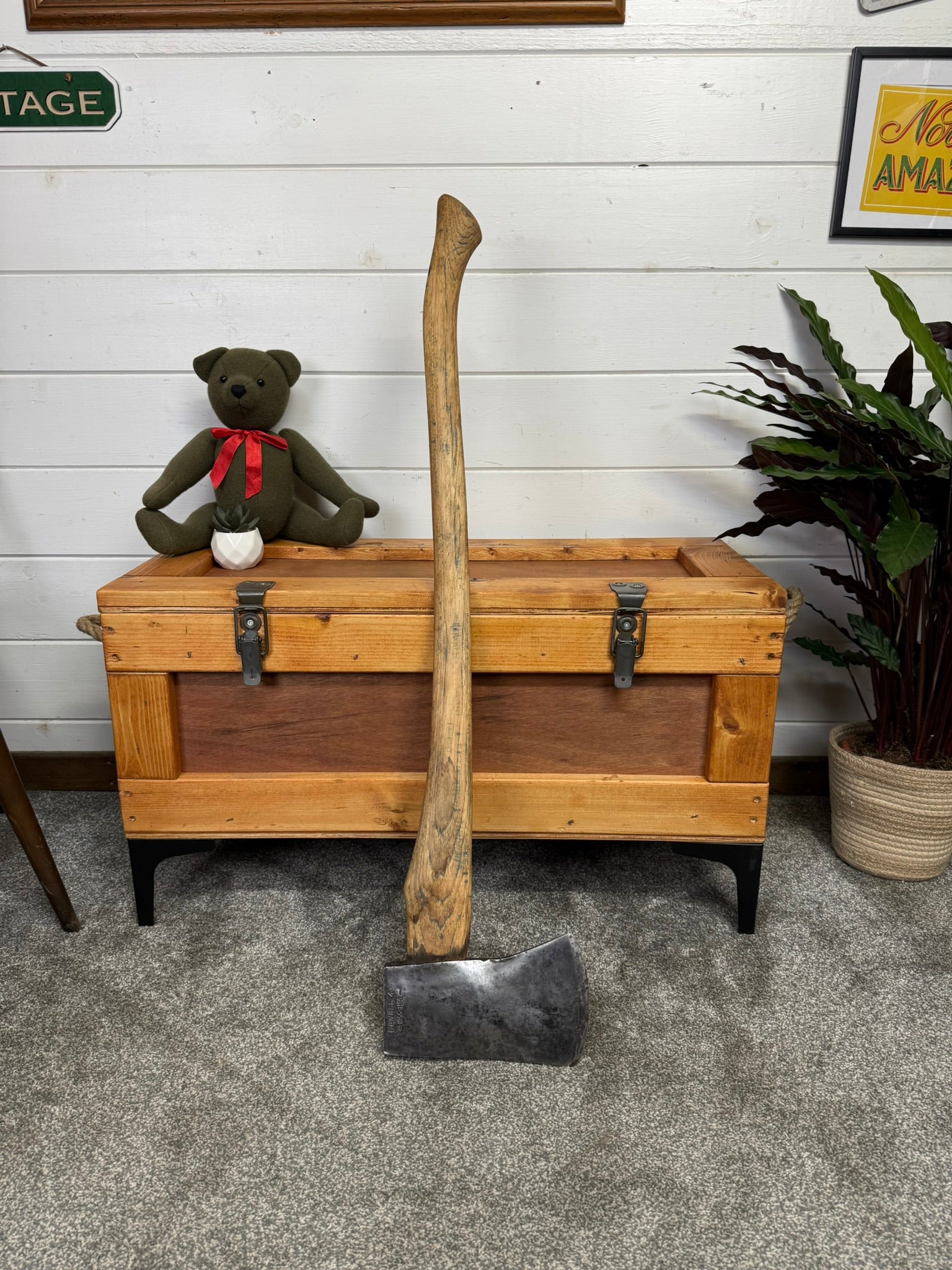 The handle has been gently sanded and treated with linseed oil for preservation, while the axe head has been lightly cleaned to reveal its markings without losing its authentic patina.